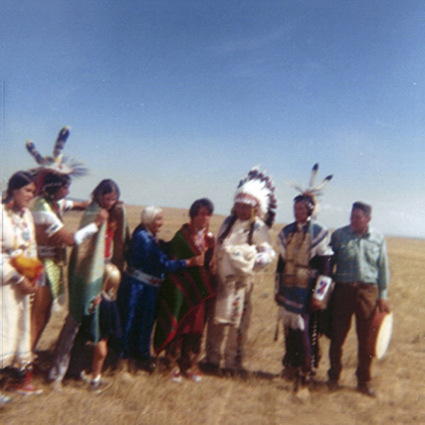 Back row - Ben Stands, Dale Old Horn, Jack Old Horn, Bernelda Bell, Lloyd “Kayle” Old Horn, unidentified, Alfred Rock Above, kneeling – unidentified, unidentified (courtesy Victoria Bad Bear)