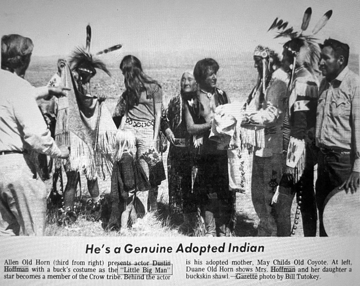 Jack Old Horn, Mrs. Dustin Hoffman, Mae Old Coyote, Dustin Hoffman, Allen Old Horn, Lloyd “Kayle” Old Horn, Warren Bear Cloud (little girl Dustin Hoffman’s stepdaughter), Billings Gazette September 18th, 1969