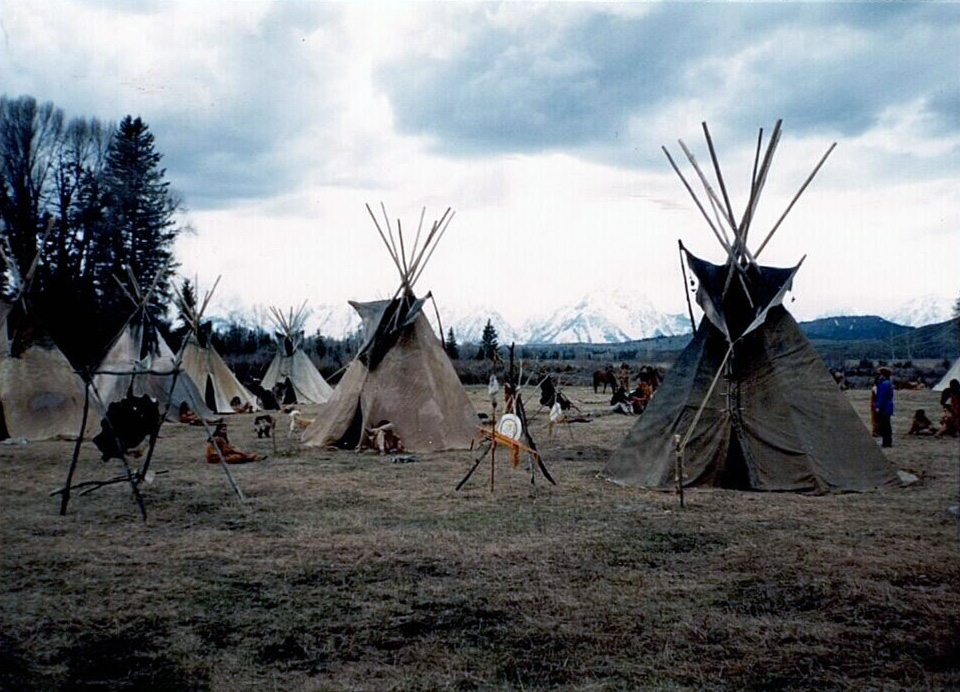 Crow women in front of lodge/tipi: Irene Bird Hat DeCrane, Mary DeCrane White, Tillie Bird Hat, and Florence Bird Hat (courtesy of Heywood & Mary Lou Big Day)